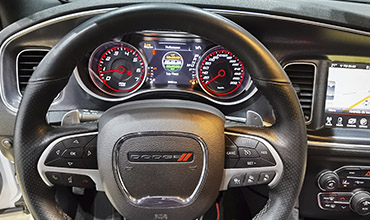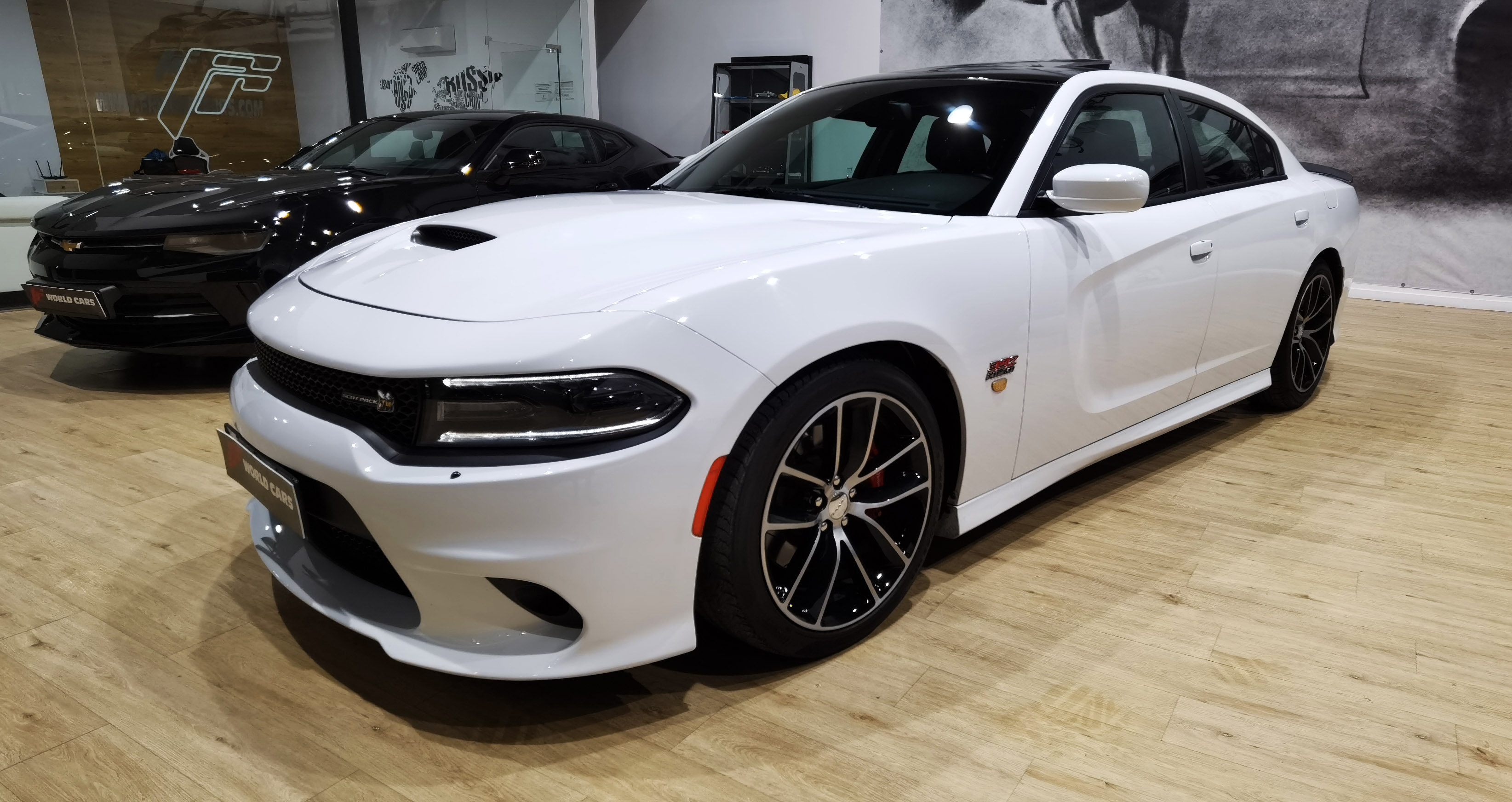 Dodge Charger SRT 392 Scat Pack, Modelo europeo 2017. Motor V8 6.4 con 495cv y cambio secuencial de 8 velocidades con levas en el volante. Acabado tope de gama SRT con el paquete Scat Pack y todos los extras posibles, en color White Knukle (Blanco) con interior especial en Alcántara y llantas en Aluminio Scat Package en 20” con frenos Brembo.